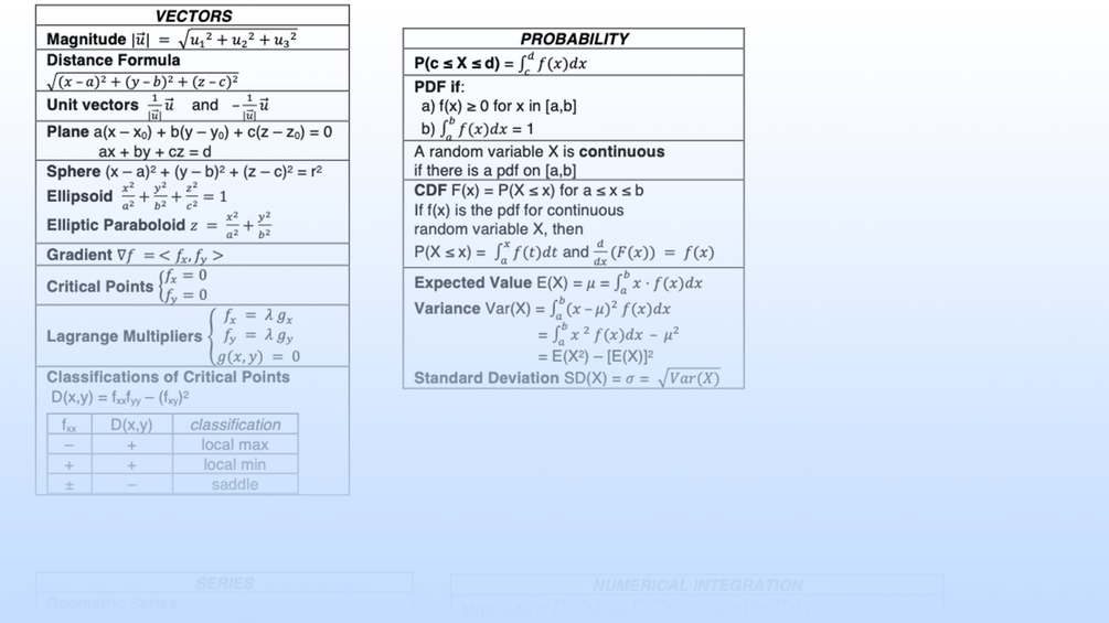 - Study Sheet: a 1-2 page document that further condenses the notes from the cram pack^ that I make for that course. typically contains important formulas and definitions that I would have trouble memorizing. great for last minute reviews before an exam!